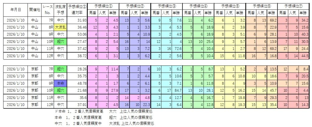 1月10日(土)波乱度予想、予想順位一覧 後半