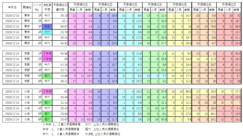 2月14日(土)波乱度予想、予想順位一覧 前半