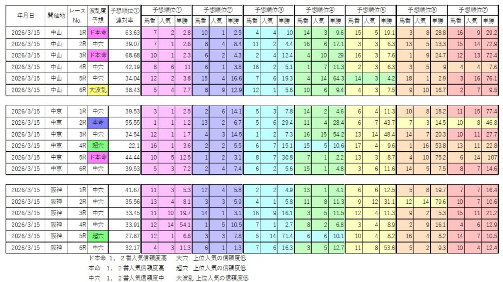 3月15日(日)波乱度予想、予想順位一覧 前半