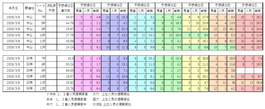 3月8日(日)波乱度予想、予想順位一覧 後半