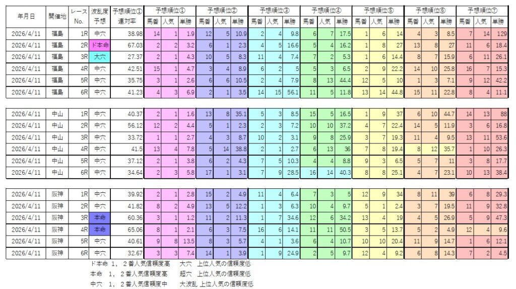 4月11日(土)波乱度予想、予想順位一覧 前半
