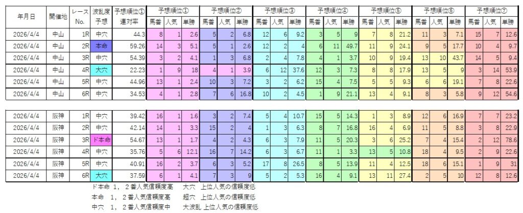 4月4日(土)波乱度予想、予想順位一覧 前半