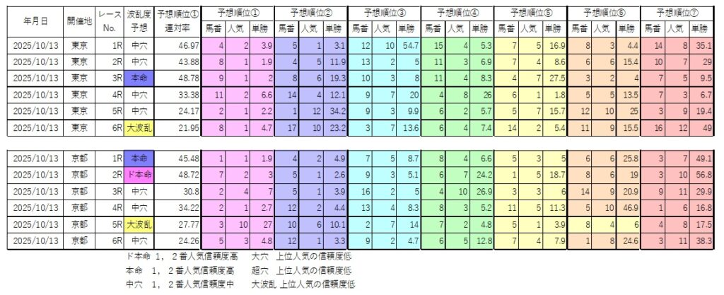10月13日(月)波乱度予想、予想順位一覧 前半